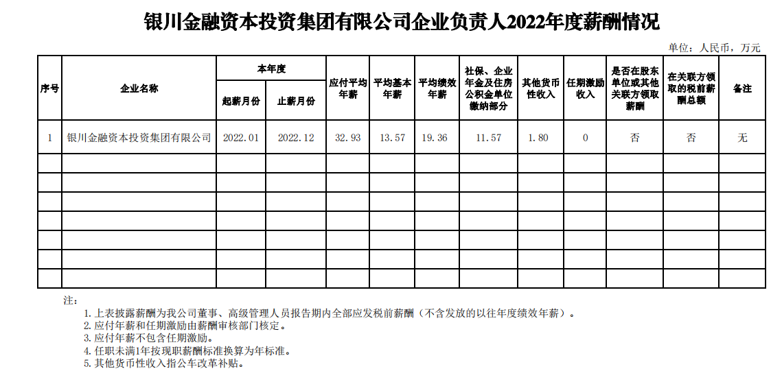 銀川金融資本投資集團國有企業(yè)負(fù)責(zé)人 2022 年度薪酬情況